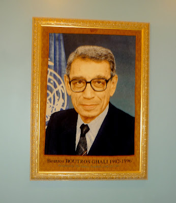 The building is, understandably, extremely limited in its accessibility unless you're a delegate or head of state or with a tour group. I fit none of those categories (I had spent the morning trying to avoid a wayward Crackberry-to-face at the hands of a restless first grader and I was not about to spend an hour with multiple children), and could venture only so far. The current exhibitions featured climate change, indigenous issues, and disaster relief, particularly after the earthquake in Haiti. Unfortunately I was too shy to ask someone to take a picture of me in front Ban Ki-moon's portrait with a silly grin and two thumbs way, way up, so these will have to suffice: